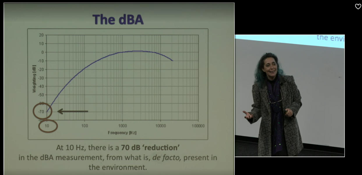 The speaker Mariana Alves-Pereira states she does not pay any attention to any scientific paper that evaluates infrasound based on dBA measurements as the low frequency sounds do not show up in calculations, yet legislation regarding infrasound measurements from wind farms states this tool is what should be used which seems to indicate that legislation chose what works best for ignoring the real negative effects of infrasound from industrial wind farming. Using dBA in the manner used as legislation requires is "scientifically invalid" she states.